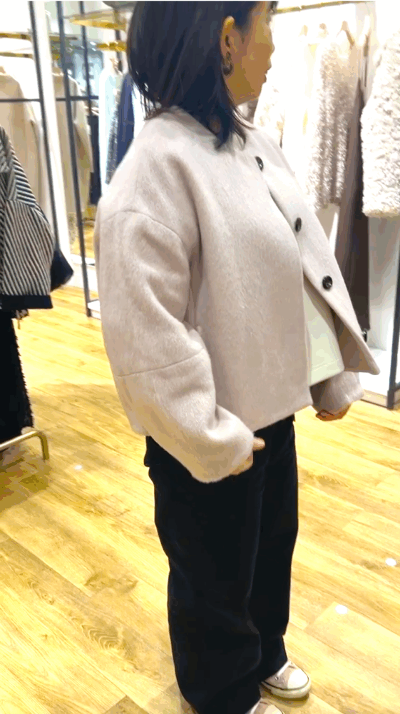 コートも短丈が似合います。体が膨らんで見えないような素材感を選びに注意です。必ず試着をして肩周りや背中にボリュームが出ない素材を選びます。